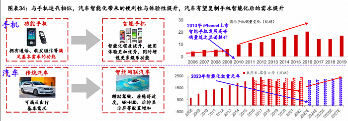 与手机的迭代逻辑类似,中泰证券认为,汽车智能化有望复制手机智能化撬动的需求提升。