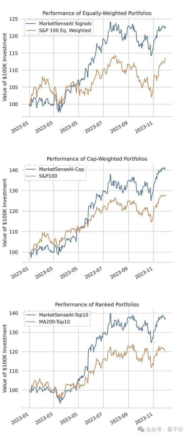 基于上述五个部件“组合拳”的能力,作者在与美国标普100指数做对比后,给出了在等权重投资组合(Equally-Weighted Portfolios)、资本化加权投资组合( Capitalization-Weighted Portfolios)和排名投资组合(Ranked Portfolios)三个方面的性能表现结果。