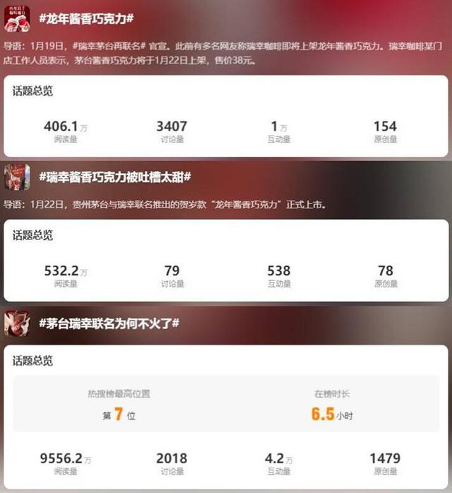 线上传播方面,1月19日,微博话题#瑞幸茅台再联名#曾冲上热搜第5位。但新品发布后,截至1月23日15时30分,微博话题#龙年酱香巧克力#的阅读量仅为406万。与此同时,#瑞幸酱香巧克力被吐槽太甜##茅台瑞幸联名为何不火了#等负面话题却引发大量关注。