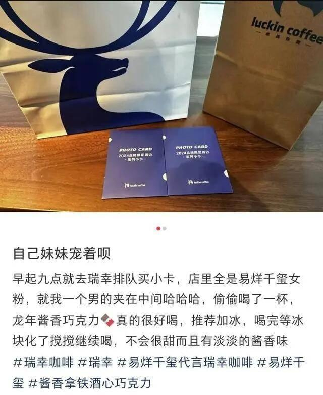 记者在微博和小红书上搜索与酱香巧克力相关的内容,发现许多都与易烊千玺及其小卡相关,#易烊千玺瑞幸小卡##瑞幸易烊千玺小卡#等微博话题的阅读量加起来已破7000万次。一位小红书用户称,自己早起9点去瑞幸排队买小卡,店里全是易烊千玺的女性粉丝,只有他一个男性顾客。