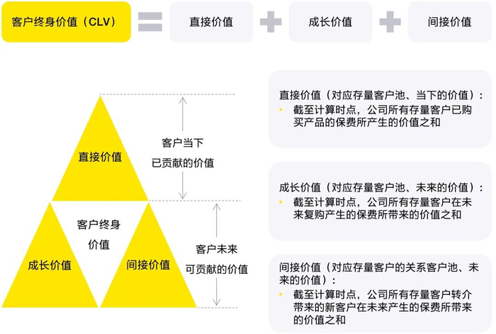 保险公司的客户终身价值由三方面构成,分别是客户的直接价值、成长价值、间接价值。直接价值,是截至计算时点,公司所有存量客户已购买产品对应的保费所产生的价值之和,反映的是公司的客户资产在当下已贡献的价值。成长价值,是截至计算时点,公司所有存量客户在未来复购产生的保费所带来的价值之和。间接价值,是截至计算时点,公司所有存量客户转介带来的新客户在未来产生的保费所带来的价值之和。成长价值和间接价值所反映的都是公司的客户资产在未来可贡献的价值。