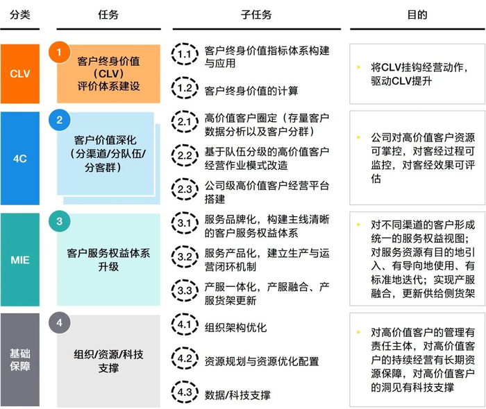 开展面向高价值客户的客户终身经营体系建设工作。从客户终身价值出发,我们梳理出了保险公司建设客户终身经营体系的“2+3+3+3”任务地图。保险公司可以以此为参照,选择符合自身实际情况的切入点,选择一个或多个任务起步,一边设计一边实践,通过与业务紧密结合的改进举措牵引公司完成体系性的建设和优化,带动公司实现转型。