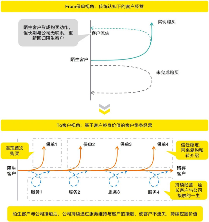更久的保留周期。保险公司需要主动延长客户与公司接触的一生,借助产品和服务体系创造交互机会、提升交互频率,不断增进客户对公司的信任。