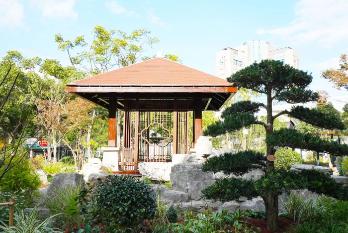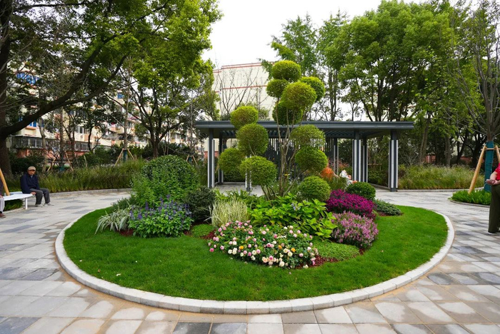 公园保留原生大香樟、雪松、桂花,通过新增彩化植物、新优地被植物来丰富季相色彩。入口处的树阵广场供居民进行太极、舞蹈、早操等日常活动,并增设景观坐凳等休憩设施。