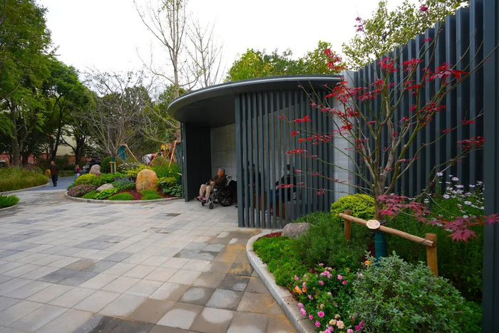 年轮公园位于爱博四村门口,该口袋公园在满足周边居民日常休闲需求的同时,兼顾相邻幼儿园、托老所的入口缓冲功能。