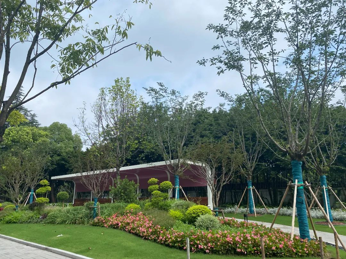 绿化保留了原有大部分乔木,增加早樱、晚樱、木绣球等适生植物来提升景观效果,点缀花境来增添植物景观亮点。