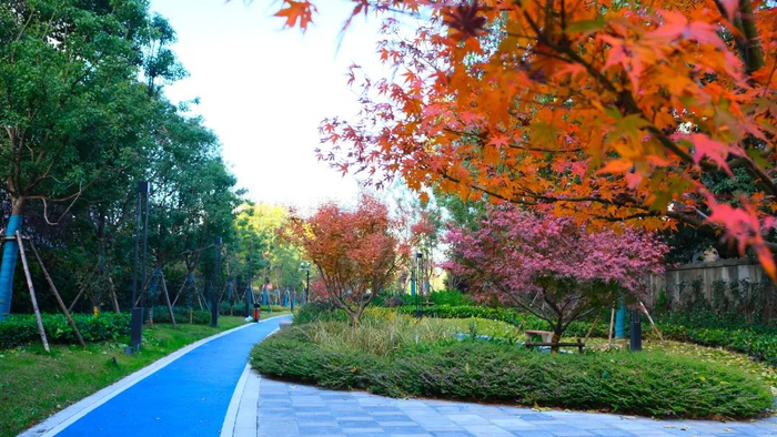 绿植景观以“棠绣丹枫”为主题,选用了多品种北美海棠,呈现出紫红、深粉、白色等不同花色;“枫”则有三角枫、枫香等,与花境植物共同形成“四季见绿”的景观效果。