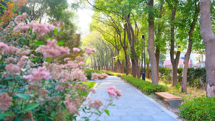 半里绿廊位于静安区江场西路501号东侧,地块呈狭长廊状,建设时保留原有香樟林作为骨架,新种红枫、紫薇,林下种植八仙花、翠芦莉、鼠尾草等耐荫开花地被,点缀种植观赏草,让林下绿廊给人眼前一亮的感觉。
