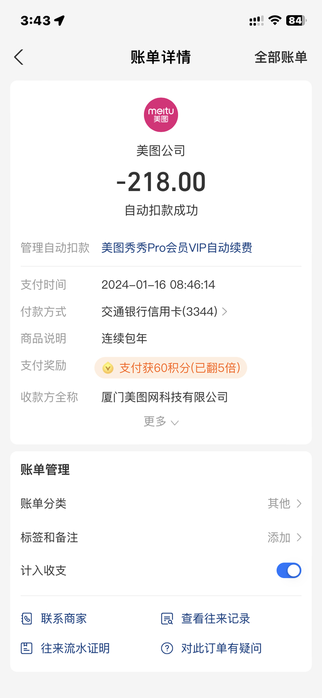 董先生告诉澎湃新闻,七天试用会员期间他仅在第一天使用过一次,“就一次,还体验不好,最后还是我用电脑做好的”。1月16日,在没有任何短信提示的情况下,他的支付宝账户忽然被扣款218元。董先生说,点进账单界面后,发现是美图秀秀会员在自动续费。