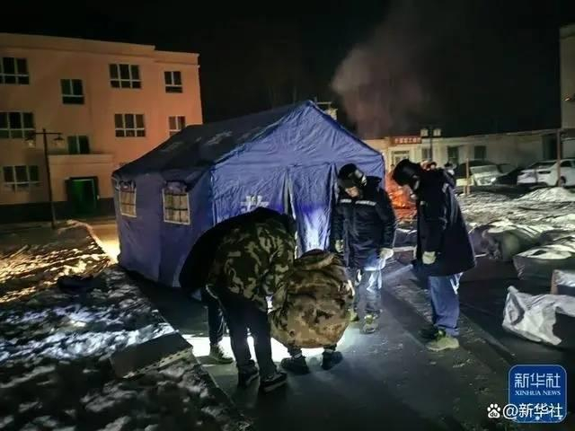 1月23日凌晨,国网阿合奇县供电公司工作人员在阿合奇县临时安置点架设照明设备。新华社发
