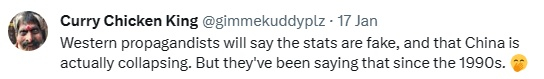 网友@Curry Chicken King说,西方的宣传者会说,“这些统计数据是假的,中国实际上正在崩溃”。但他们自上世纪九十年代以来就一直这么说(嘲笑脸)。