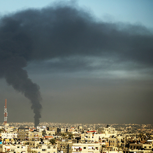 1月22日,汗尤尼斯遭以色列轰炸,城市上空浓烟滚滚。图片来源:央视新闻
