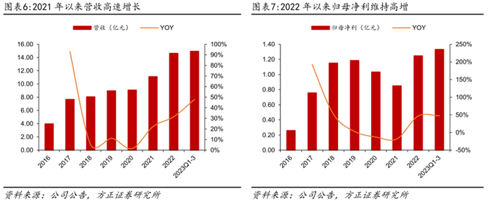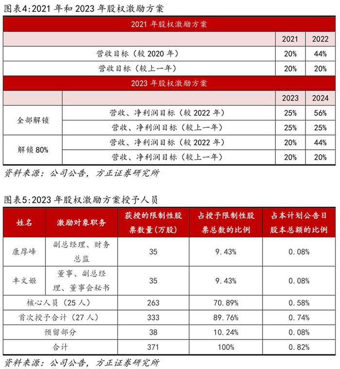 上市后两轮股权激励,充分激发员工积极性。公司上市后分别于2021年和2023年实行了两轮股权激励计划,2021年第一期股权激励目标考核期为2021和2022年,现已全部解锁。第二期股权激励目标为2023年营收、净利润增长均不低于25%(均不低于20%解锁80%),2024年相比2022年营收、净利润增长均不低于56%(均不低于44%解锁80%)。2023Q1-3公司营收和净利润分别同比增长47.85%和52.46%,预计2023年可以全部解锁。两次股权激励对象均涵盖财务总监康厚峰、董秘丰文姬等核心高管团队,有利于激发员工积极性。