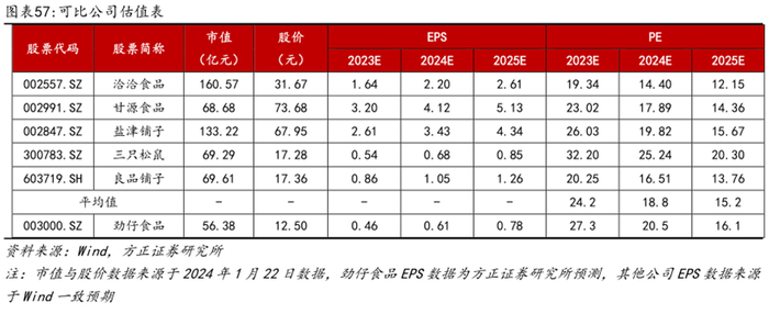 可比公司估值对比:洽洽食品、甘源食品、盐津铺子、三只松鼠、良品铺子均为休闲食品企业,主营业务相似,因此将其作为可比公司进行对比。横向对比来看,2024年可比公司估值均值为18.8X,劲仔食品2024年PE为20.5X,高于行业均值水平,考虑到公司处于高速增长期,给予“强烈推荐”评级。