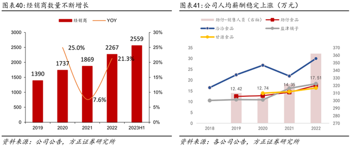 经销商数量不断拓展,销售团队不断扩大。为覆盖更多市场及拓展现代渠道,近年来公司不断扩充经销商队伍和销售团队,经销商数量从2019年的1390家拓展至2023H1的2559家,销售人员从2019年的310人提升至2022年的362人,同时销售人员的人均年薪酬从2019年的12.42万元增长至2022年17.51万元,与行业保持同频。