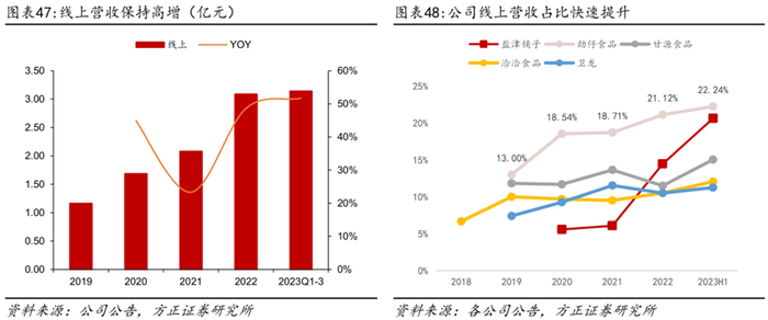 线上营收快速提升,营收占比处于行业领先地位。线上营收从2019年的1.16亿元增长至2022年的3.09亿元,CAGR为38.48%,2023Q1-3实现营收3.14亿元,同比增长51.69%。线上营收增速快于整体增速,带动线上占比迅速提升,从2019年的13%提升至2023H1的22.24%,超过盐津铺子、甘源食品、洽洽食品和卫龙。
