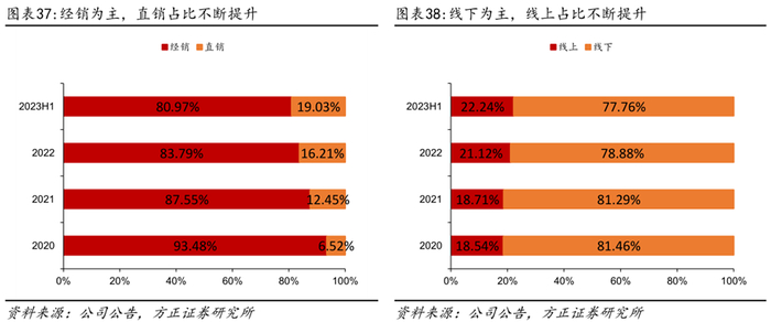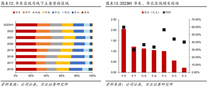 华东地区为线下主要营收区域,23H1华东、华北增速亮眼。华东目前为线下主要营收来源,2023H1营收占比为28%,华中、西南、华南、华北营收较为接近,占比在14-17%之间,西北和东北为薄弱地区,营收占比低于10%。2023H1华东、华北地区营收分别增长59.76%和56.44%,主要系公司实行大包装策略和新品推广,直营商超系统增长较快。