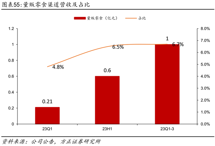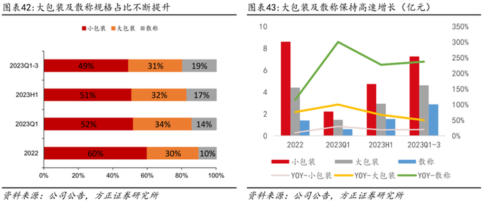 招商侧重大包装及散称,大包装及散称营收占比快速提升。从经销商的结构来看,近期公司新签约经销商中有较大比例是大包装、散称型经销商,有助于填补渠道空白和提升弱势渠道势能,拓展全国连锁KA、CVS连锁便利系统等现代渠道覆盖率。大包装和散称维持高速增长,大包装23Q1-3同比增长50%,散称同比增长237%,品牌势能提升带动小包装同比增长20%(22年增速仅为10%)。散称营收占比从2022年的10%提升至23Q1-3的19%,小包装占比从60%下滑至49%,大包装占比从30%提升至31%。