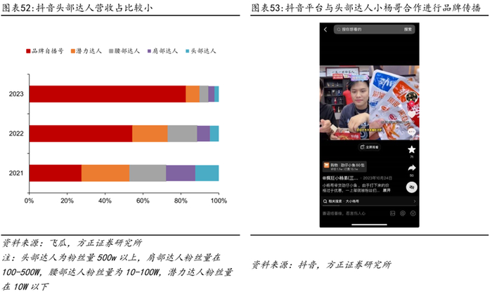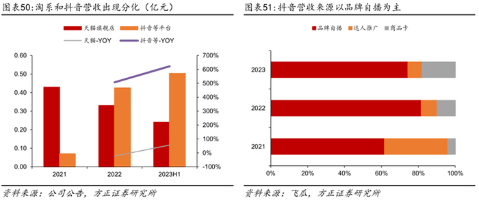 建立从头部流量到自播带货的传播矩阵,头部主播引流,自播及中腰部达人起量。分达人种类来看,抖音营收中达人占比不断下降,从2021年的72.21%下降至2023年的17.19%,其中头部达人的营收占比最低,2023年为2.28%,主要系品牌推广,肩部、腰部、潜力达人的营收占比依次提升,分别为3.29%、4.45%、7.17%,传播矩阵较为均衡合理,营收过于依靠头部主播的风险较低,有利于长期发展。