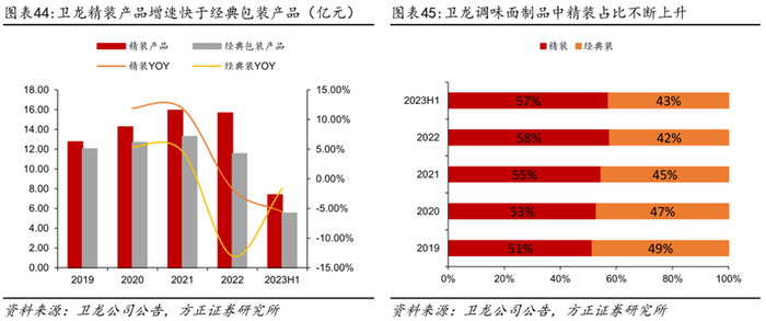 大包装战略助力品牌势能提升,对标卫龙发展空间有待开拓。复盘卫龙发展历程,其2015年进军现代商超并推出白袋精装产品实现产品形象升级,2019-2022年卫龙精装产品的营业收入均超过经典包装产品营收,白袋精装产品占调味面制品营收比重从2019年的51%提升至2022年的58%,占比超过经典款并不断扩大差距。23Q1-3劲仔小包装/大包装营收占比分别为49%/31%,对标卫龙大包装未来仍有较大增长空间。