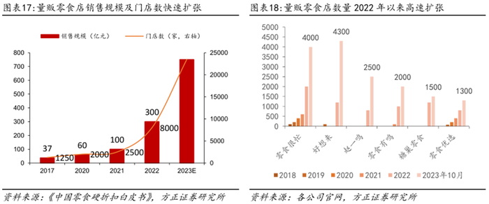顺应性价比,量贩零食发展加速。以低价为特征的量贩零食店契合下沉市场性价比消费需求,门店数量及行业规模快速扩张。根据《中国零食硬折扣白皮书》,我国量贩零食店销售规模从2017年的37亿元增长至2022年的300亿元,2023年有望达到700-800亿元,量贩零食门店数量从2017年的1250家增长至2022年的8000家,2023年预计将达到2.2-2.5万家。头部系统加速开店,零食很忙10月突破4000家,好想来突破4300家,赵一鸣超2500家,零食有鸣超2000家。