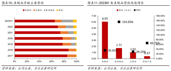 鱼制品贡献主要营收,鹌鹑蛋带动禽类制品高增。产品结构方面,鱼制品营收占比仍然最大,2023H1达到65%,随着鹌鹑蛋的快速放量,禽类制品2023H1营收同比增长155.05%,带动禽类制品营收占比提升至18%,豆制品营收下降至2023H1的11%。
