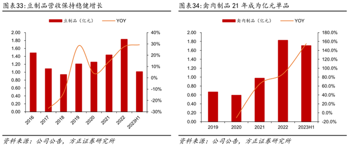 豆制品及肉干均为过亿单品,保持稳健增长。豆制品近年来保持较快增长,从2018年的0.94亿元增长至2022年的1.83亿元,CAGR为18.12%。2023H1同比增长29.23%至1.01亿元。禽肉制品中的“手撕肉干”上市以来快速发展,2021年实现营收0.98亿元进入亿元单品行列,在鹌鹑蛋带动下,禽肉制品2022年开始保持高速增长。