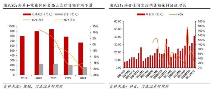 抖音成为休闲食品重要销售渠道。受天猫淘宝和京东整体流量下滑影响,其休闲食品销售额也出现下降,天猫淘宝休闲食品销售额从2021年的937.97亿元下降至2023年的661.42亿元,下跌幅度为29.5%。京东休闲食品销售额从2020年的219.47亿元下降至2023年的161.23亿元,下跌幅度为26.4%。在天猫京东等传统电商平台增速放缓的背景下,高速增长的抖音成为休闲食品企业挖掘增量的重要渠道。2023年抖音休闲食品销售额为327.9亿元,同比增长44.9%,已经超越京东。