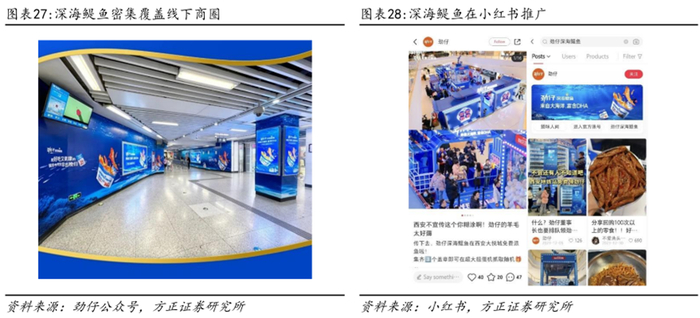 线下西安试点覆盖高端消费场景,线上持续曝光占领消费者心智。为推广深海鳀鱼,公司线上线下同时发力。线下主要在西安进行试点销售推广,举办了50场商超活动和40场写字楼活动,触达60万+目标消费者,通过梯媒等媒介覆盖1700+高端写字楼和2000+高端社区,全面覆盖工作+生活场景。年货节期间在西安举行“龙宫新年大派对”主题快闪店活动,与冰峰联名推出新春限定款礼盒,关注度持续提升。市场终端方面目前已覆盖300+家便利店。线上在微博、小红书、抖音、朋友圈等多平台上线广告,曝光超4800万+。