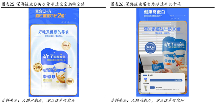 新品深海鳀鱼上市,多重升级引领行业创新。2023年8月推出深海鳀鱼产品,售价为12.9元/58g,相比普通款12.9元/96g提升了65.5%,有望增厚利润空间。该产品在原料、配料等方面进行升级,精选尺寸更长(约6cm鳀鱼,与现有劲仔小鱼相比尺寸大20%)、肉感更好的鳀鱼鱼胚,使用优质配料如甘肃“大红袍花椒”、山东“金乡辣椒”、广西“天然无硫八角”等,生产工艺方面采用精细的全自动化工艺生产线,可去头去内脏并具有充氮锁鲜包装。新品深海鳀鱼营养丰富,相比普通鳀鱼蛋白质和DHA含量更高,每100g产品蛋白质含量达33g,超过牛奶10倍,每100g劲仔深海鳀鱼产品DHA含量高达160mg,超过了《食品安全国家标准婴儿配方食品》中宝宝奶粉的两倍。此外劲仔深海鳀鱼采用行业首创“0防腐、0糖、0色素”的工艺标准,持续引领行业升级潮流。