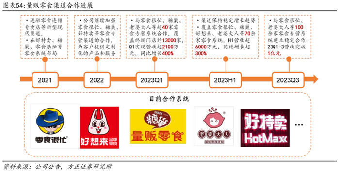 23年以来合作进度明显加快,低基数有望实现高增长。公司在2021年就对零食连锁专卖店等新型现代渠道有所布局,进驻好特卖、糖巢、零食很忙等零食量贩店。但2023年以来合作进度明显加快,营收快速增长。23Q1合作40+家系统,覆盖终端门店约13000家,实现营收超2100万元,同比增长400%,23H1合作系统数量增加至70+家,实现营收6000万+,同比增长超300%,环比增长86%,23Q3合作超100家零食系统,23Q1-3实现营收超1亿元,营收占比为6.7%。目前量贩零食渠道基数仍然较低,与其他企业相比仍然偏低,如盐津铺子2023H1零食量贩占比约17%,未来有望维持高增长趋势。