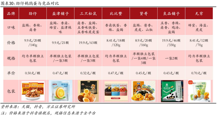 价格偏高定位中高端,精选原料包装独特差异化优势显著。与竞品相比,小蛋圆圆鹌鹑蛋单价为0.5元/颗,在行业中处于较高水平,定位中高端,与产品品质相匹配。小蛋圆圆有盐焗、香辣、卤香三种口味,在口味丰富度上并不占优,但其选用湖南岳阳绿色生态养殖基地的精品鹌鹑蛋,以煨制散养鸡汤和多种天然香辛料炖卤鹌鹑蛋,后进行高温烘烤,最终成就好吃又健康营养的鹌鹑蛋产品。产品包装上全部采用独立包装形式,内袋鹌鹑蛋采用水滴型拉伸膜包装,单颗独立小袋,既方便食用,又做到最大程度保鲜。