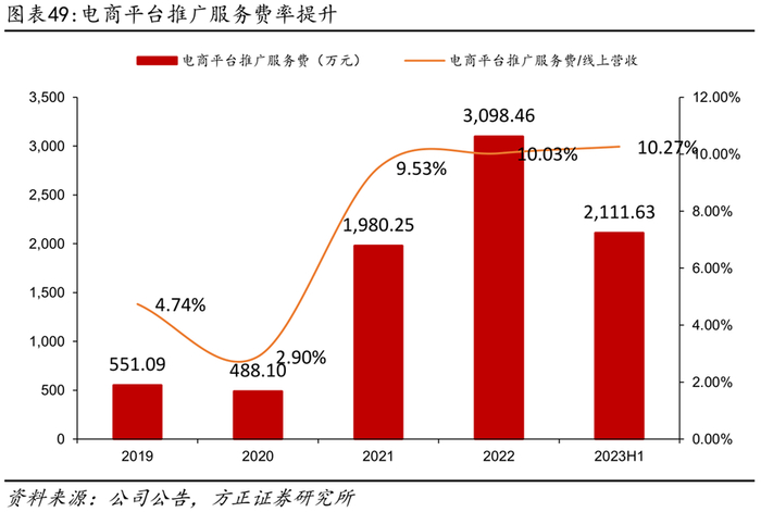 电商推广服务费显著增加,加大小红书、抖音、B站推广。公司2021年开始加大电商投入,电商平台推广服务费从2019年的551万元提升至2022年的3098万元,其占线上营收比重从2019年的4.74%提升至2023H1的10.27%。公司在小红书、抖音等新兴平台上加强与热门主播KOL的绑定,加大劲仔品牌在年轻群体中的曝光率,并开展了“抖音CNY”等活动,带动线上营收及品牌知名度不断提升。
