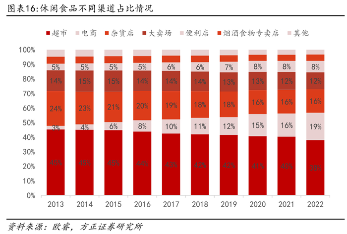 商超卖场流量下滑,但仍是最大销售渠道。根据欧睿数据,尽管超市、大卖场近年来流量下滑,但仍然是休闲食品最大的销售渠道,2022年超市+大卖场销售占比为50%。