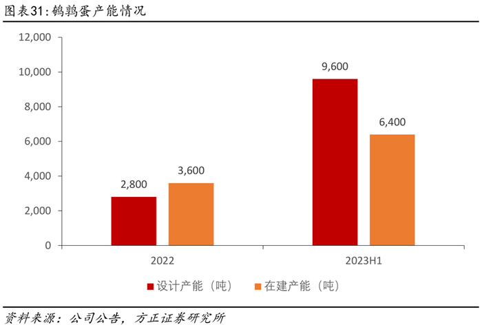产能快速增长,未来产能有望集中,上游供应链不断优化。2022年推出鹌鹑蛋产品以来,鹌鹑蛋产能快速扩张。2022年设计产能为2800吨,在建产能为3600吨,2023H1设计产能提升至9600吨,在建产能为6400吨。根据公司公告,目前鹌鹑蛋产能较为分散,后期会打造集中化产能基地,规模效应下生产效率有望提升,运输等成本有望下降,同时与上游供应商建立紧密合作,稳定采购价格,建立了更加稳定、优质的原材料供应链,鹌鹑蛋盈利能力有望提升。