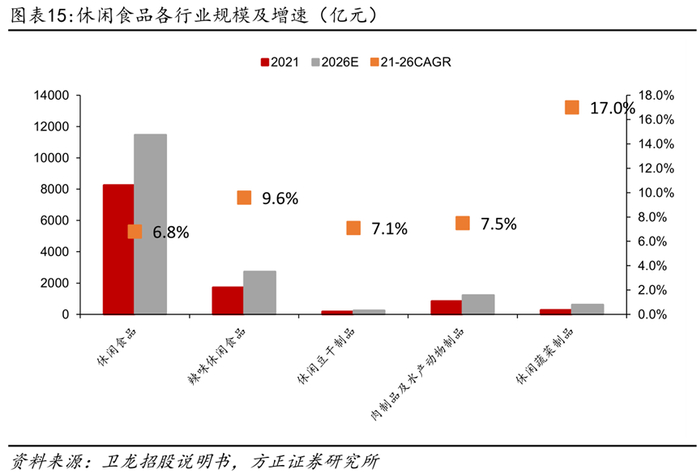 休闲蔬菜制品行业零售额21年为286亿,2026年有望达到626亿元。根据卫龙招股说明书,休闲蔬菜制品行业零售额从2016年的146亿元增长至21年的286亿元,CAGR为14.4%,2026年有望达到626亿元,21-26年CAGR为17%。