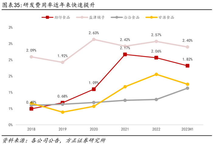 加码研发投入,持续创新引领行业。为维持行业领先优势,公司近年来加大研发创新投入,研发费用率从2018年的0.49%提升至2023H1的1.82%,在可比公司中处于较高水平。公司研发创新重点围绕健康化趋势和提升产品品质发力,如开发低脂低盐产品、0添加防腐工艺、低温杀菌工艺等。