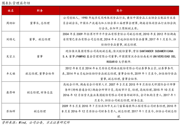 高管团队经验丰富,专业能力强。公司积极从外部引入专业人才,并于2019年将总部迁至省会长沙以便吸引更多优秀人才。核心管理团队均具有丰富的从业经验和强大的专业能力,董事长拥有30多年休闲食品从业经验,副总经理刘特元曾在平平食品和俏嘴巴等企业任职,副总经理、董秘丰文姬曾在克明面业任职,副总经理、财务总监康厚峰曾在会计师事务所任职。
