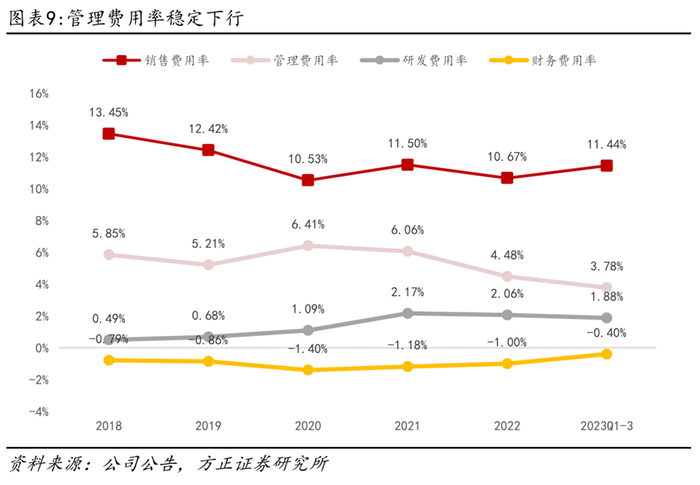 销售费用率保持稳定,管理费用率稳步下降。近年来公司仍处于高速增长期,销售费用与营收均保持快速增长,2020年至今销售费用率整体稳定在10.5-11.5%之间。管理费用增长有所控制,规模效应下管理费用率不断下降,从2020年的6.41%下降至2023Q1-3的3.78%。近年来重视研发投入,研发费用率有所提升。
