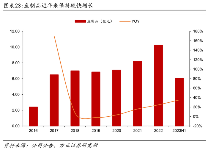 大包装策略助力鱼制品增长提速,22年突破十亿营收。2011年公司开始布局鱼制品赛道,2017年成为鱼制品行业第一,2017-2022年稳居休闲鱼制品领域行业第一,其中连续多年在淘系、京东平台保持即食鱼类零食行业第一。2018-2020年增速有所放缓,2021年实行大包装策略拓展现代渠道,增长提速,2021年和2022年分别同比增长15.9%和24.7%,并于2022年突破10亿营收,2023H1同比增长35.01%至6.03亿元。