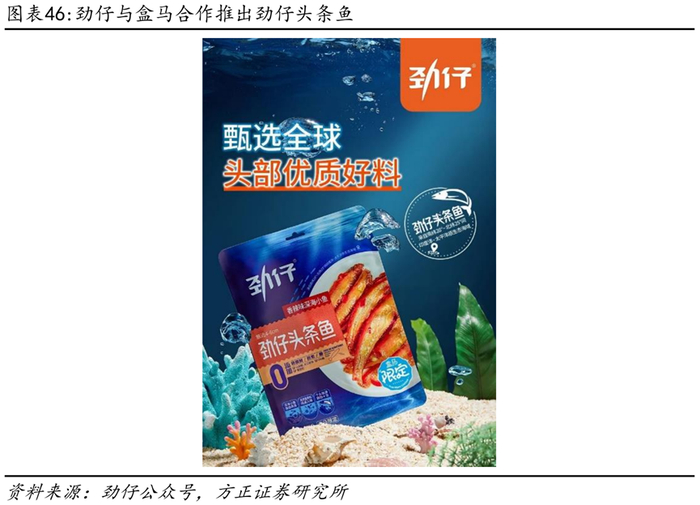 盒马限定“劲仔头条鱼”,发力高端会员店。2023年3月公司进驻盒马鲜生高端会员店,为其定制了“劲仔头条鱼”产品,包括香辣味和酱汁味,定价为15.9元/128g,与普通劲仔小鱼12.9元/96g相比便宜约8%,采用行业领先的“0防腐剂、0人工色素、0添加糖”的工艺,更具健康属性。上市5个月热销超300万+,占领盒马鲜生新品榜和鱼肉小食热卖榜top1。我们认为进入盒马会员店证实公司强大的产品研发能力,未来有望拓展其他会员店系统。