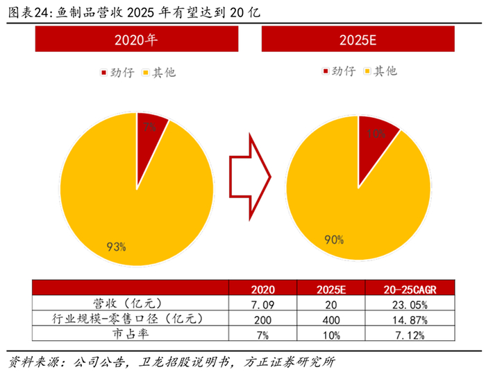 小鱼干龙头市占率约7%,对比卫龙增长潜力巨大。根据公司公告,2020年休闲鱼制品零售总额为200亿,公司鱼制品实现营收7.09亿元,假设其终端加价倍率为2倍,零售口径销售额达14亿,市占率约7%,对标辣条龙头卫龙2021年调味面制品市占率为14.3%,未来提升空间较大。假设2025年休闲鱼制品零售规模为400亿,公司市占率为10%,则对应报表端营收20亿,对应22-25年CAGR为23.05%。
