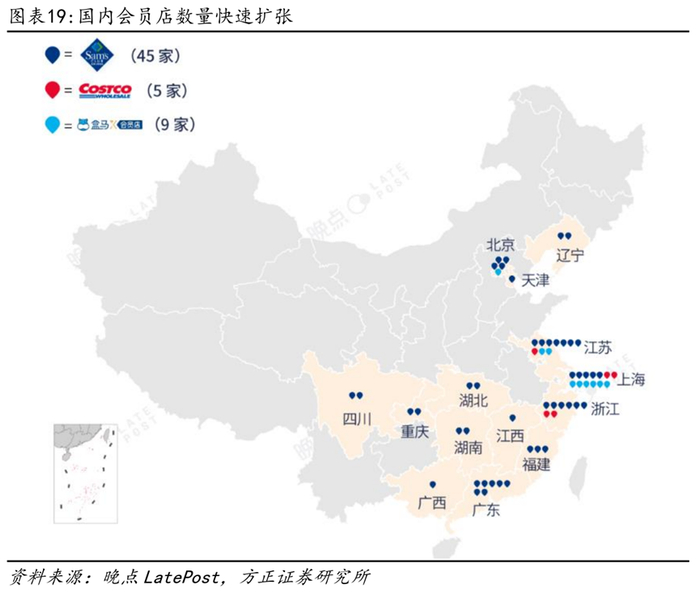 高收入人群扩容,高端会员店方兴未艾。随着高收入人群的不断扩容,对高品质产品的消费需求提升,仓储式会员店热度骤升,山姆、Costco等快速开店。截止2023年8月,山姆、Costco和盒马已开出59家仓储会员店,其中山姆45家,覆盖北京、上海、江苏、广东等14个省市,盒马会员店共9家,覆盖上海、江苏、北京3省市,Costco共5家,覆盖上海、浙江、江苏3省市。