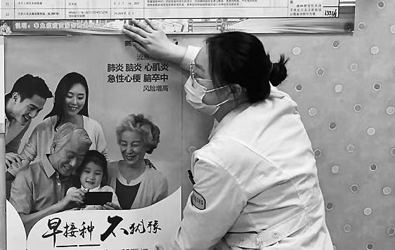 ←中医适宜技术能有效预防和治疗流感,图为医生在为市民进行中医治疗。↑在社区卫生服务中心,工作人员正在张贴疫苗接种海报,宣传科学接种流感疫苗。