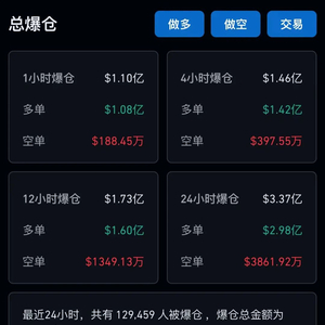 衍生品交易方面,CoinGlass数据显示,截至1月23日21时,24小时虚拟货币全网爆仓人数近13万,爆仓总金额高达3.37亿美元(约合人民币24.2亿元)。其中多单爆仓2.98亿美元,空单爆仓超3860万美元。