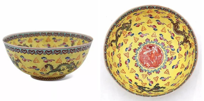 雍正的【黄地珐琅彩龙纹碗】采用的就是这种金龙纹样,寓意聚宝聚财,也有生活稳稳当当、幸福恒久之意。