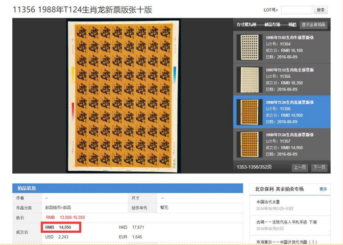 建国之后中国邮政于1988年公开发行的龙年生肖邮票,2016年北京保利春拍上,1988年龙年生肖邮票拍出1.495万元!