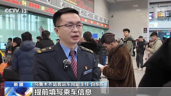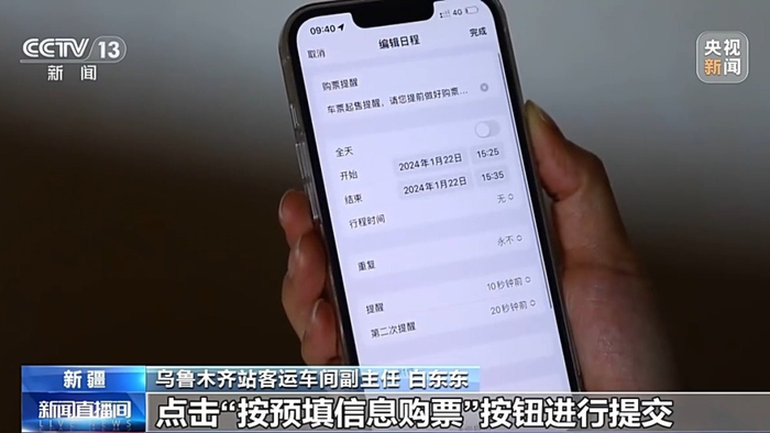 乌鲁木齐站客运车间副主任  白东东:这与之前购票最大的区别就是,提前填写乘车信息,并且支持预选车次和席别的多种组合,大大增加了成功的概率。我给大家举个例子,乌鲁木齐火车站车票起售时间是每天早上的8点30分,没有预填功能之前,我们要买除夕车票,就需要在1月26日8点30分的时候,登录12306,先查询余票,再选择车次、席别和乘车人,最后付款,而这个过程一旦信息选择错了就要重新调整,很可能错过购票时间。而有了这个预填功能后,购买除夕2月9日的车票,在1月26日0点到8点30分前的任何时间,随时可以把车次、席别和乘车人等信息填好,等发售时间一到,立即提交订单。