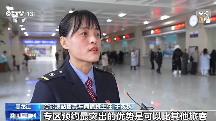 哈尔滨站售票车间值班主任  于双秋:专区预约最突出的优势是可以比其他旅客至少提前两天以上购买车票。根据咱们专区预约的购票规则,只要是符合购票条件的学生和务工人员,想购买春运期间的火车票,可预约开车前17天含以上的车票,而其他的旅客,则只能够买到开车前15天的车票。