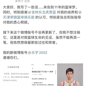 吕安宇在文中告别了自己的篮球生涯,“接下来这个微博账号不会再更新了,但我不想注销它,这里是对我篮球生命的见证,虽然不能再添一笔,但依然想保留那些过往和荣誉。”